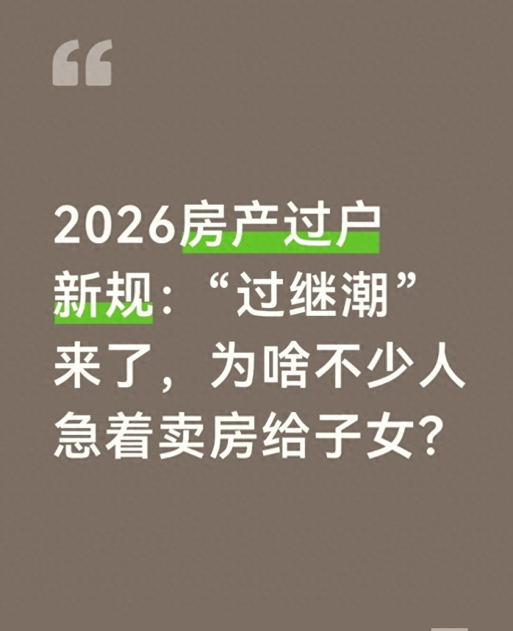 2026年刚开年,房产圈就刮起了“过继潮”——不管是城市老小区还是新城区,不少家庭都在扎堆办房产过户,要么父母卖房子给子女,要么办赠与、继承手续。这波热潮不是凭空来的,核心是2026年房产过户新规落地,流程简化、税费调整,让以前麻烦又费钱的房产传承,现在变得又快又省钱。但更关键的是,新规背后的税费逻辑和持有规则变了,让很多人算清账后,果断选择“现在卖房”,而不是等以后继承或赠与。今天就用大白话把这事讲透,不管你是想给子女传房,还是有多套房产想规划,看完都能明白其中的门道。
