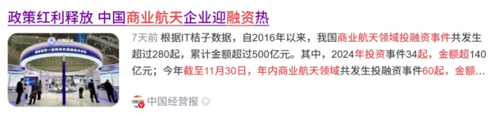 与此同时,商业航天的融资呈现高增增长态势。截至11月30日,年内商业航天领域投融资事件达60起,金额超95亿元,蓝箭航天、中科宇航等8家企业进入IPO辅导或受理阶段。