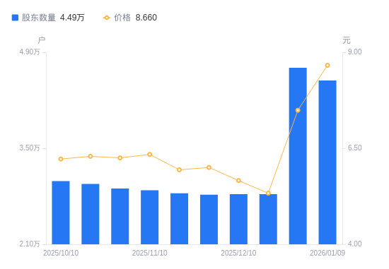 日期A股户数(户)流通A股户均持股数(股)户均持股市值(万元)2026-01-094488920734.6717.962025-12-314672719919.0814.922025-12-192831332873.9017.522025-12-102830232886.6718.612025-11-282822532976.3919.792025-11-202844232724.8019.442025-11-102886432246.3520.442025-10-312912131961.7719.982025-10-202981031163.3219.602025-10-103021630744.5919.12